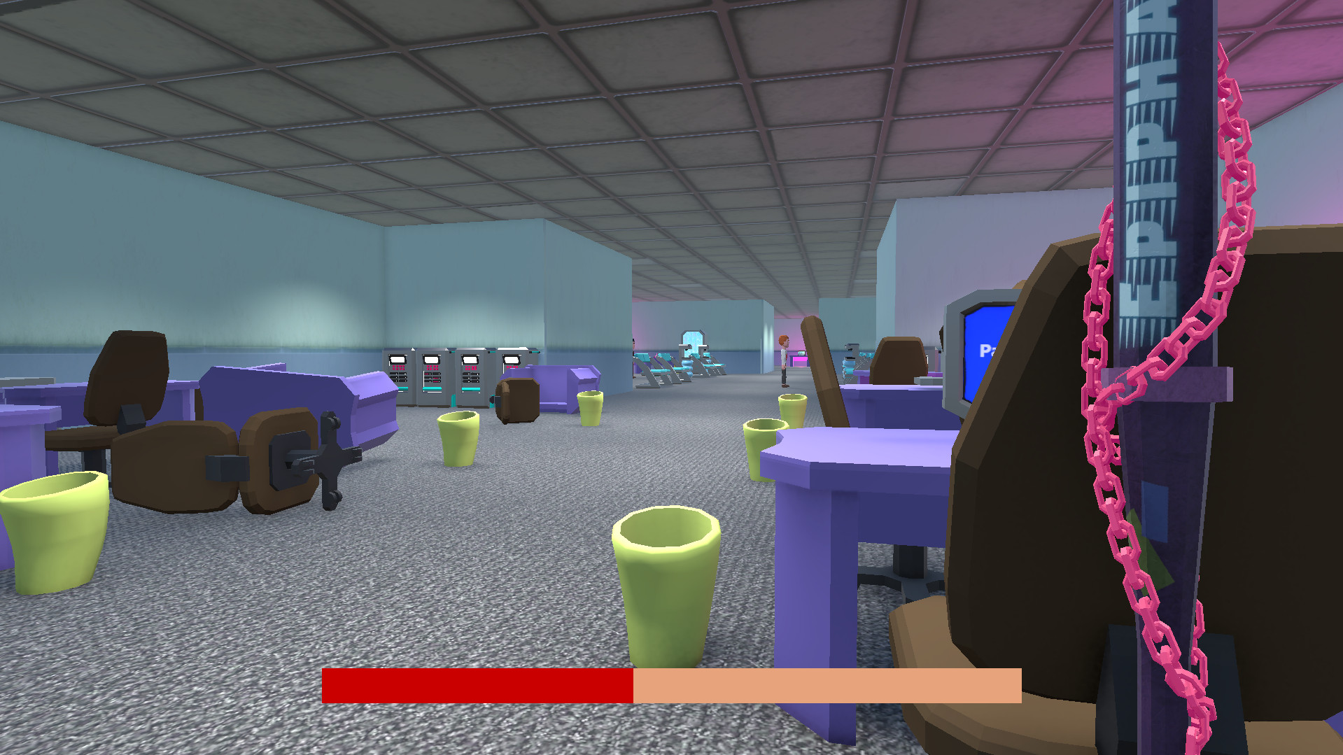 The player has a limited adrenaline meter that gradually depletes over time. Adrenaline is replenished by smashing objects and attacking colleagues who obstruct the player. Objects already struck no longer restore adrenaline.